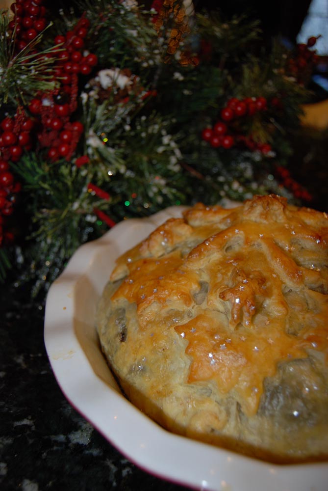 Un fold the puff pastry and place in a lightly greased, oven safe, pie plate. Place brie in center of pastry. Pour filling over the top, pull the corners of the pastry up around the brie and pinch the edges together to seal. This will create a shape a bit like a monsignor’s hat.